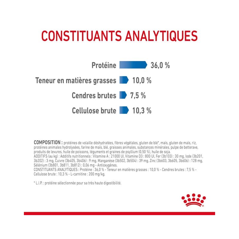 COMPOSITION: Viandes de volaille déshydratées, maïs, isolat de protéinevégétale*, fibres végétales, gluten de maïs, hydrolysat de protéines animales, graisses animales, pulpe de betterave, levures, minéraux, huile de poisson, téguments et graines de Psyllium (0,5%), huile de soja.ADDITIFS (par kg): additifs nutritionnels : Vitamine A: 20500 IU, Vitamine D3: 700 IU, E1 (Fer): 40 mg, E2 (Iode): 3 mg, E4 (Cuivre): 10 mg, E5 (Manganèse): 51 mg, E6 (Zinc): 169 mg, L-carnitine: 210 mg - Conservateurs - Antioxygènes.CONSTITUANTS ANALYTIQUES : Protéines: 40% - Matières grasses: 10% - Cendres brutes: 6.8% - Fibres alimentaires:7.3%.*L.I.P.: Protéine sélectionnée pour sa haute assimilation.