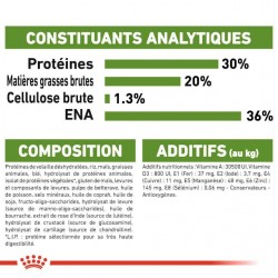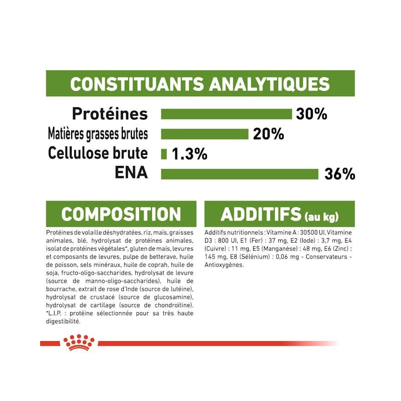 COMPOSITION: viandes de volaille déshydratées, maïs, riz, graisses animales, gluten de maïs, hydrolysat de protéines animales, pulpe de betterave, levures, sels minéraux, isolat de protéines végétales*, huile de poisson, huile de soja, huile de coprah, fructo-oligo-saccharides, hydrolysat de levure (source de manno-oligo-saccharides), hydrolysat de crustacé (source de glucosamine), extrait de rose d