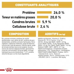 Protéines de volaille déshydratées, riz, mais, farine de blé, graisses animales, farine de mais, isolat de protéines végétales*, blé, hydrolysat de protéines animales, pulpe de betterave, huile de poisson, huile de soja, levures, sels minéraux, fructo-oligo-saccharides, téguments et graines de psyllium, hydrolysat de levure (source de manno-oligo-saccharides), huile de bourrache, extrait de rose d