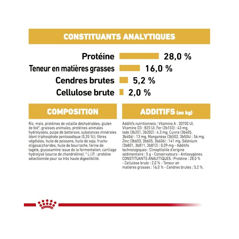 Riz, protéines de volaille déshydratées, protéines de porc déshydratées*, farine de maïs, graisses animales, hydrolysat de protéines animales, gluten de maïs, maïs, sels minéraux, pulpe de betterave, fibres végétales, isolat de protéines végétales*, huile de soja, huile de poisson, téguments et graines de psyllium, fructo-oligo-saccharides, hydrolysat de levure (source de manno-oligosaccharides), hydrolysat de crustacé (source de glucosamine), extrait de rose d