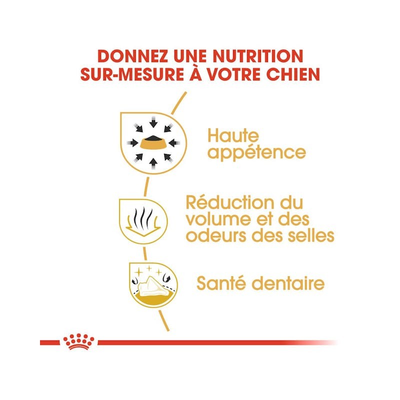 SANTE DIGESTIVE Combinaison exclusive de nutriments assurant une excellente sécurité digestive (protéines L.I.P.) et un bon équilibre de la flore intestinale (prébiotiques : FOS, MOS), participant à l’amélioration de la qualité des selles du chiot.