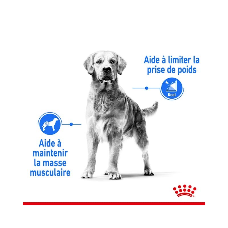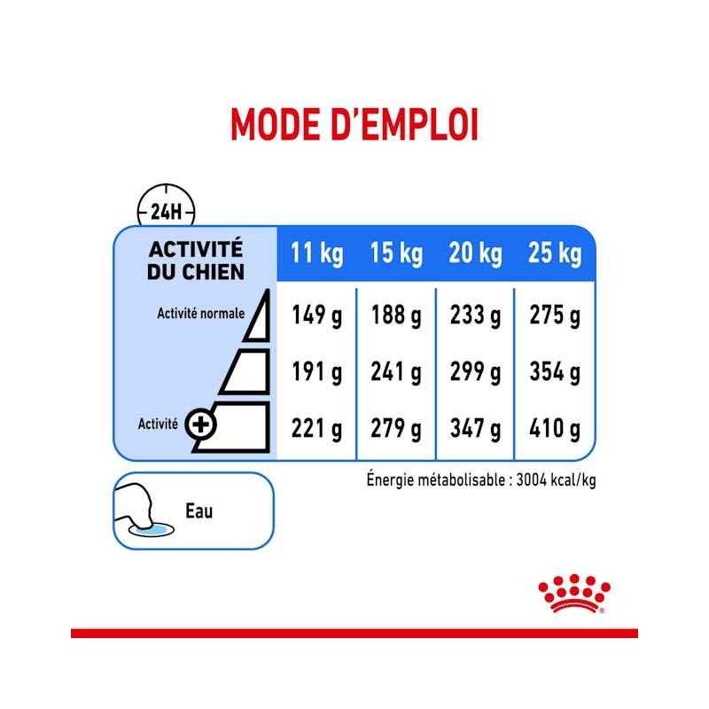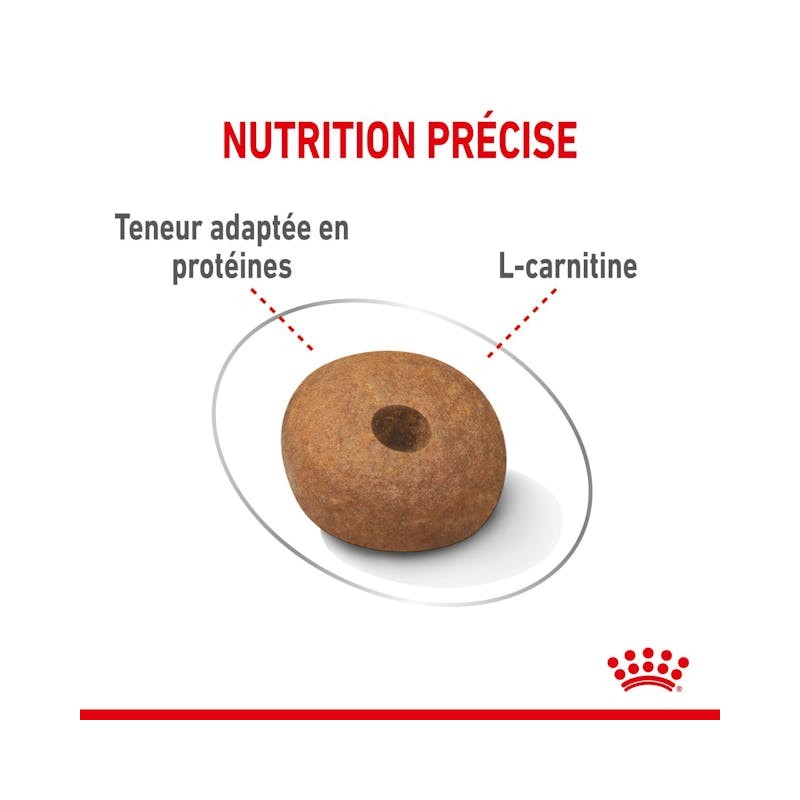 Permet de diminuer de 30 %* l’énergie consommée par le chien pour un même volume donné. Aide à atteindre et conserver le poids idéal en combinant un taux de protéine renforcé (27 %), un apport faible en matières grasses (11%) et de la L-carnitine pour stimuler le métabolisme des graisses tout en préservant la masse musculaire.